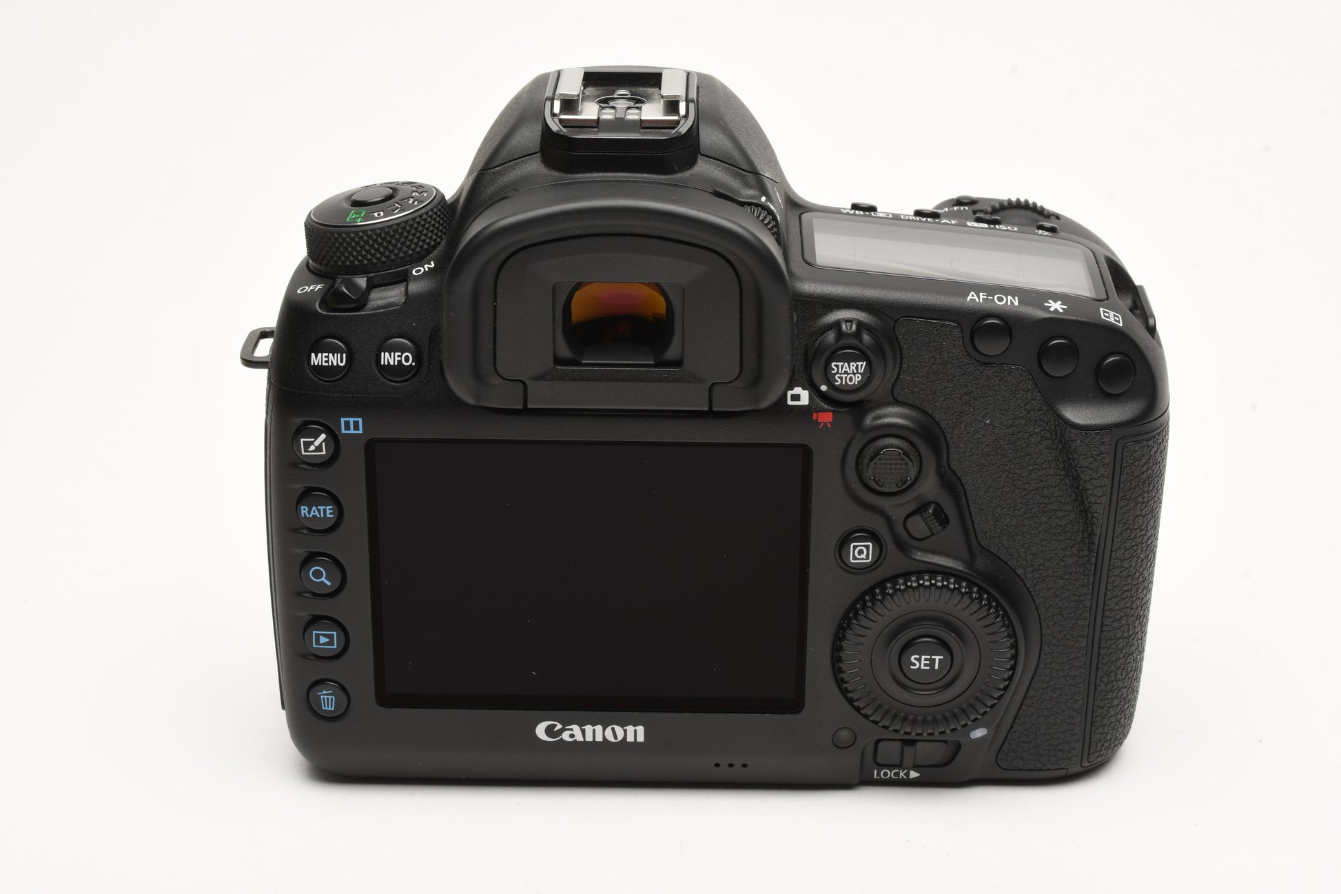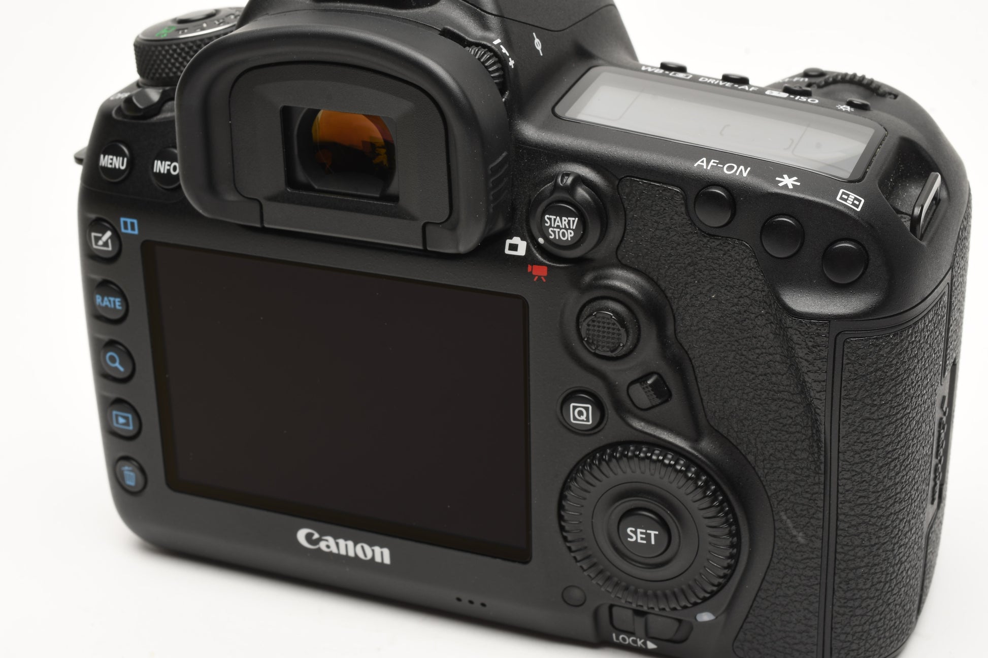 Includes Canon LC-E6 charger, battery, body cap and rubber eyepiece