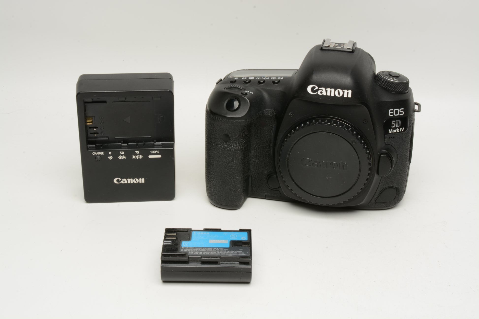 Includes Canon LC-E6 charger + Canon battery, body cap and rubber eyepiece