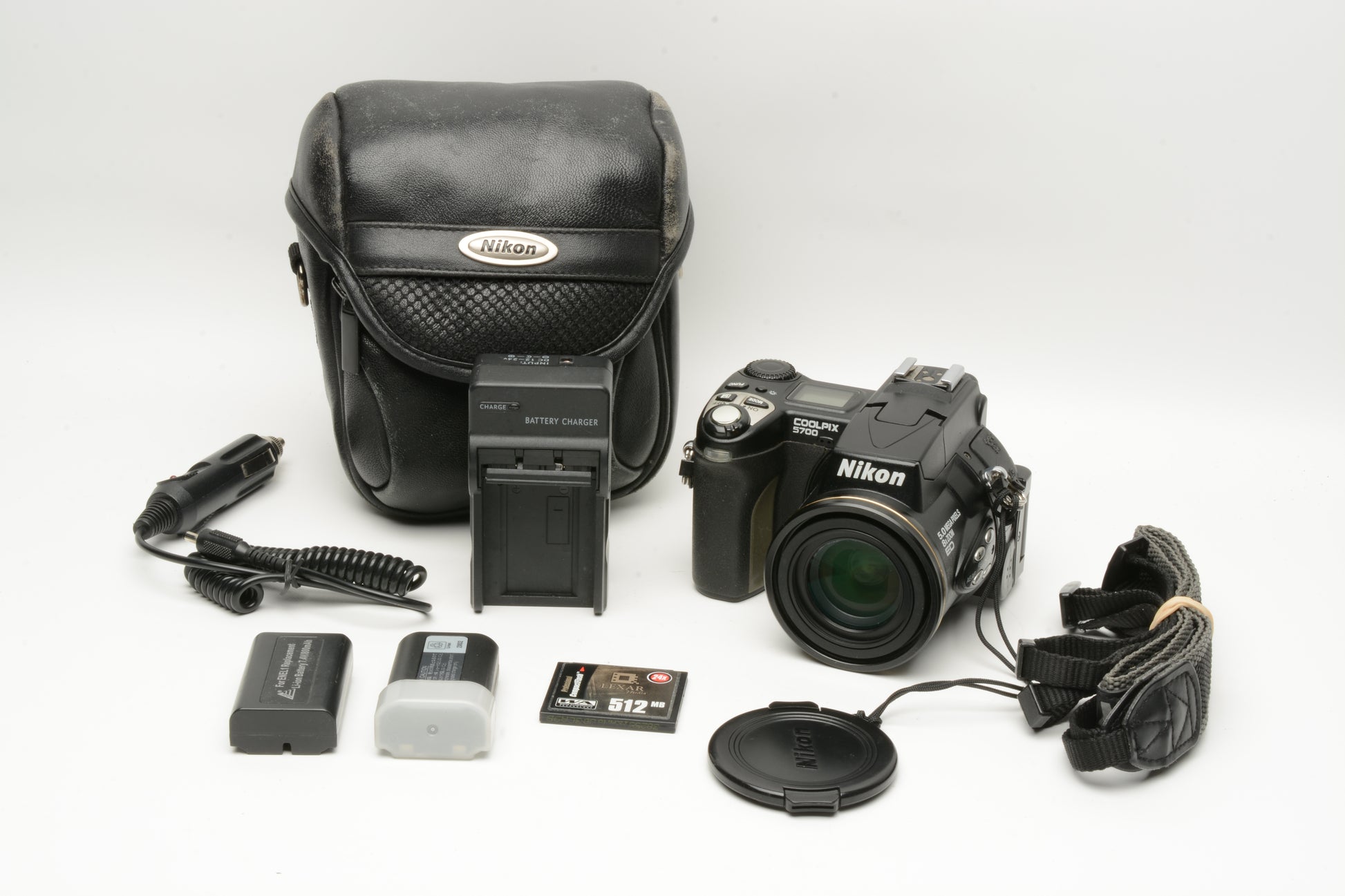 Includes 2X batteries, AC/DC charger, strap and lens cap + 512MB CF card in a nice fitted Nikon case