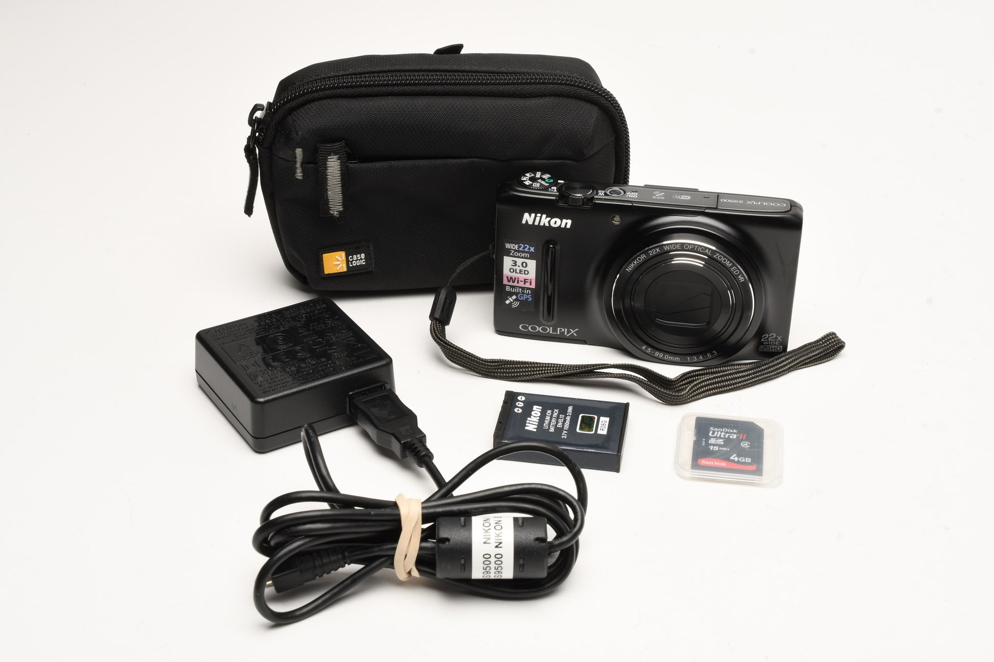 Includes Nikon battery, USB cable and charging module, wrist strap and clean padded Case Logic case + Bonus 4GB SD card