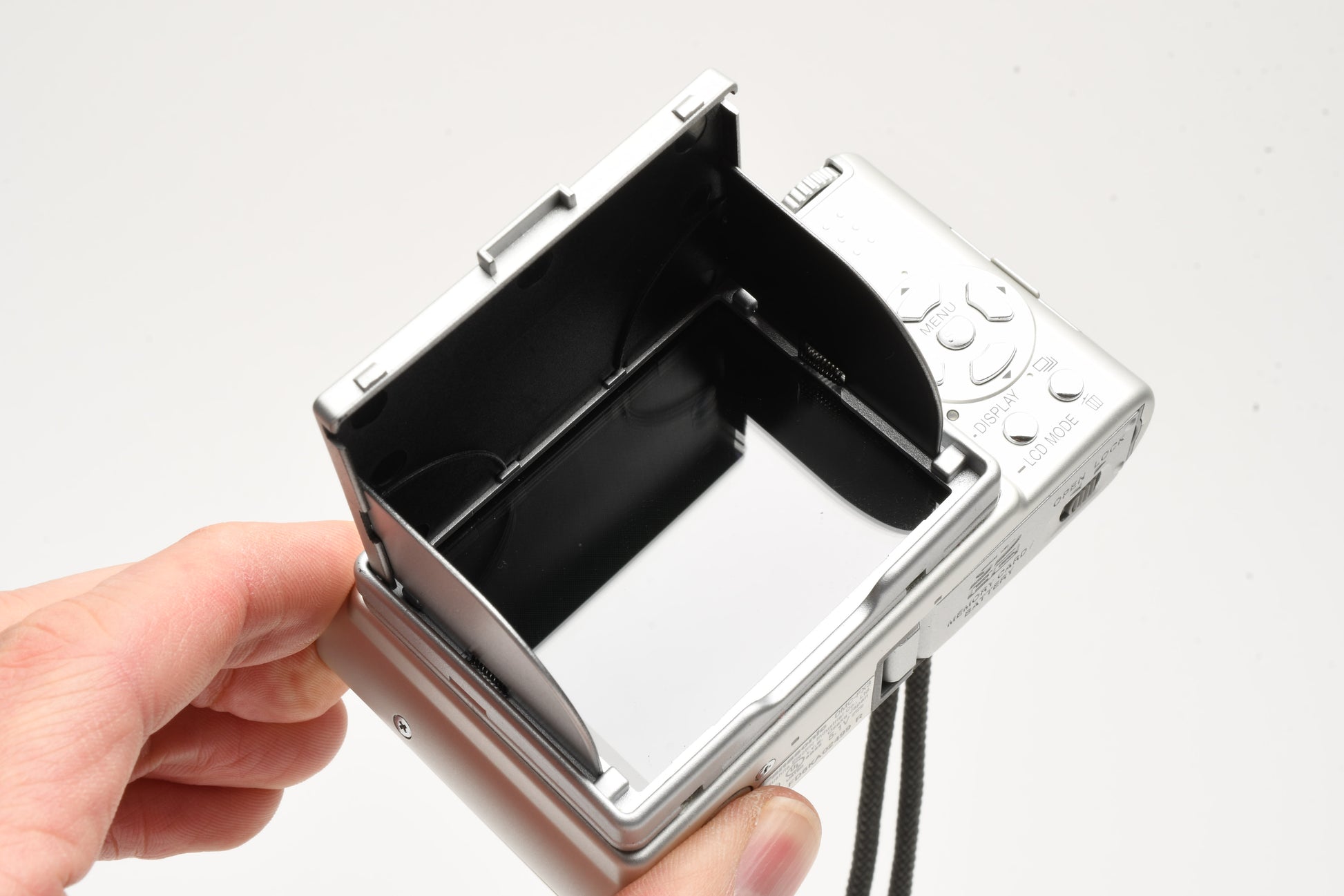 Includes battery, charger, wrist strap, AV and USB cable, and instructions manual. Also includes an LCD shield at back