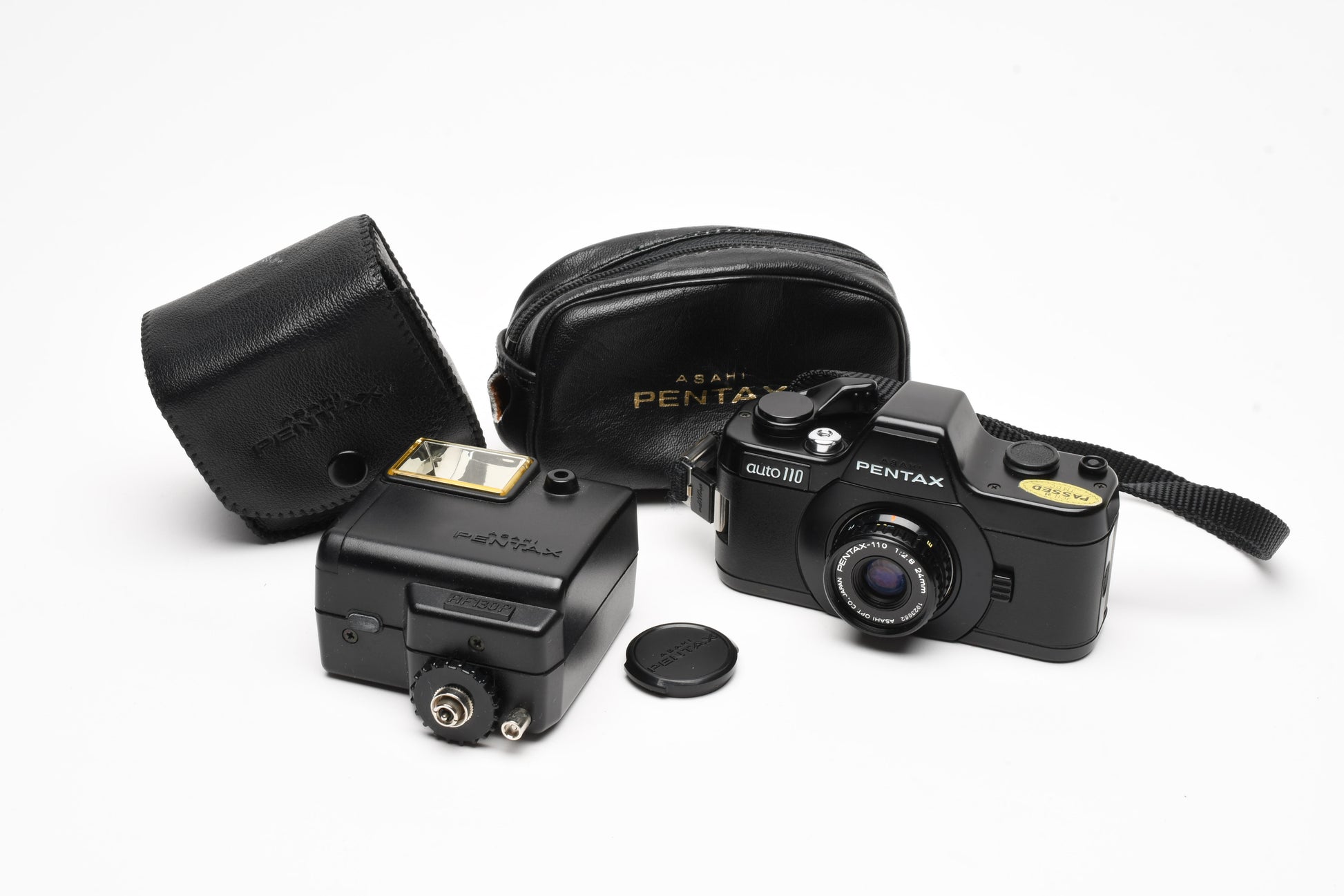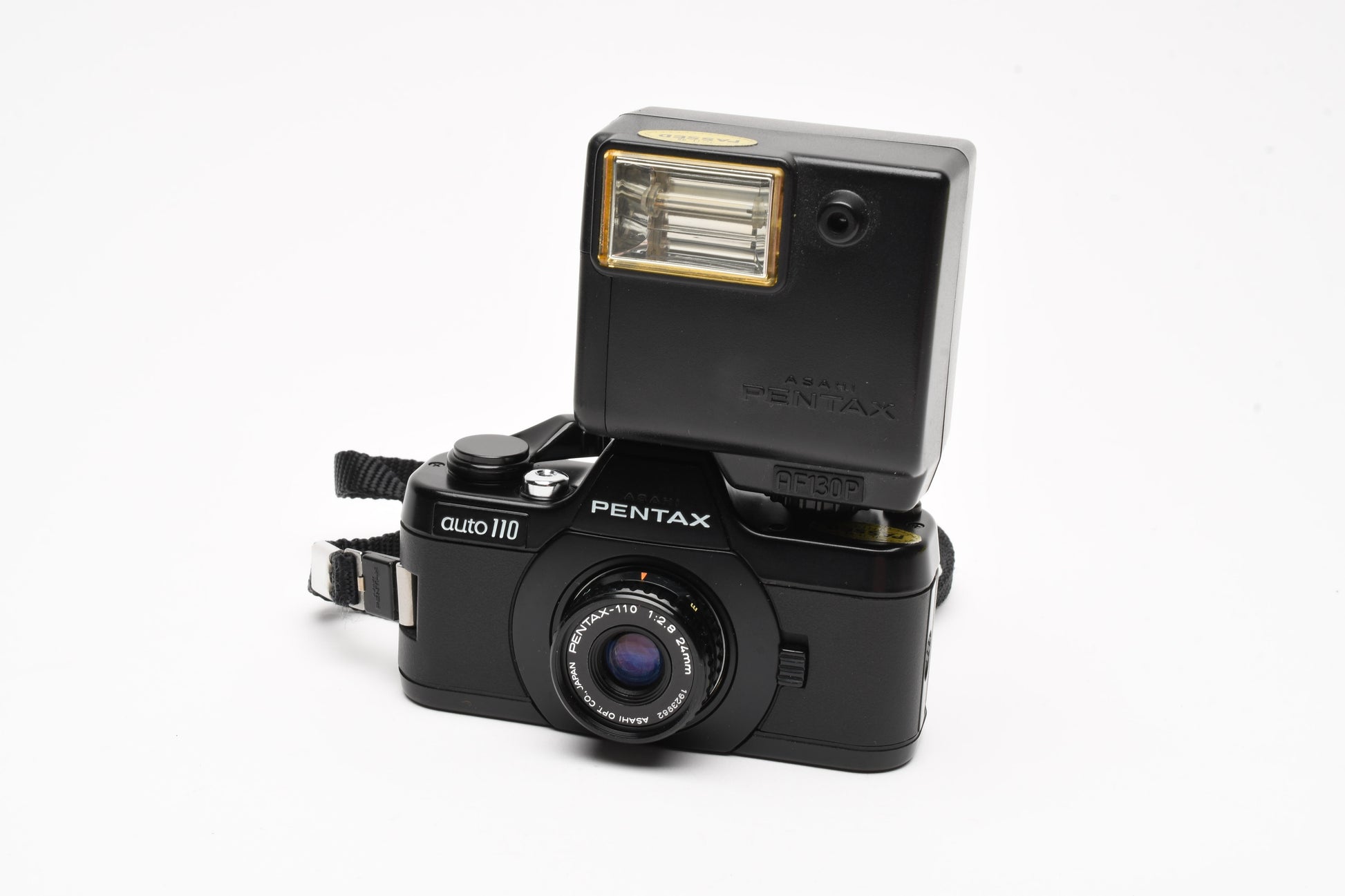 Pentax Auto 110 w/24mm f2.8, case, wrist strap, +AF130P Flash, Tested